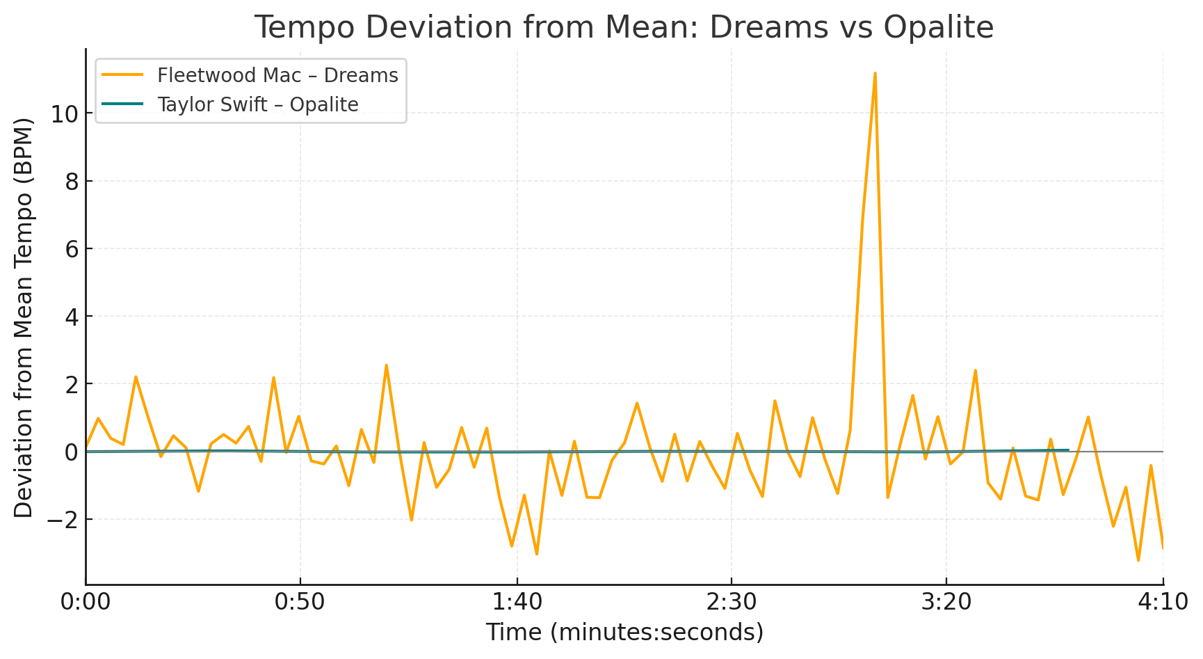 Taylor Swift’s song is perfectly locked to a grid and Fleetwood Mac’s song drifts all over the place. Maybe Swift’s audience prefers precision. Maybe this is just the sound of contemporary production. Maybe nobody cares about tempo variance except aging audiophiles clutching their brittle vinyl.